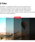 Filtret fungerar inte bara som ett verktyg för kreativ fotografering, utan även som ett effektivt skydd för din drönarkamera. Det skyddar linsen mot repor, damm, smuts och vattenstänk – utan att försämra bildskärpan. Tack vare den robusta ramen i aluminiumlegering och det hårda optiska glaset är filtren både lätta och hållbara, perfekt anpassade för flygning i varierande miljöer.