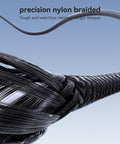 Den flätade nylonkabeln är extra slitstark och resistent mot böjningar, slitage och trassel.