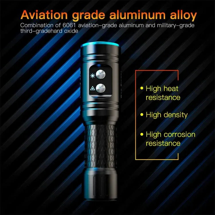 Den robusta designen, tillsammans med effektiv kylning och vattentät tätning, gör denna ficklampa till ett oumbärligt verktyg för dykare, fotografer och räddningspersonal.