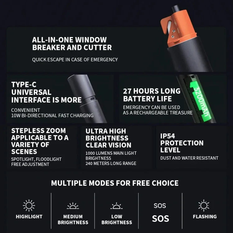 Multifunktionell Ficklampa 1000lm med Batteri och Räddningsverktyg