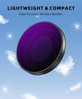 Med måtten 2,7 × 2,7 × 0,5 cm är filtren små nog att alltid få plats i fickan eller kameraväskan. De är designade för att vara portabla och enkla att byta ut på plats. För dig som ofta är på språng – oavsett om det gäller resor, äventyr eller sport – är det en stor fördel att alltid kunna ha rätt filter nära till hands.