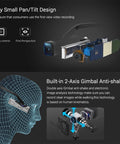 Kameran kan vinklas 90° uppåt eller nedåt så att du enkelt anpassar bildvinkeln efter situationen. Oavsett om du går, springer eller arbetar nära objekt får du en stabil, naturlig bild utan störande rörelser.