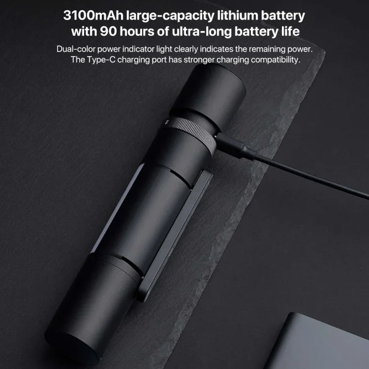 Ficklampan har ett inbyggt batteri på 3200 mAh. Det ger upp till 27 timmars användning beroende på valt ljusläge. Det gör att ficklampan fungerar under både korta uppdrag och längre äventyr. Laddningen sker via USB-C, vilket är en modern och snabb lösning.